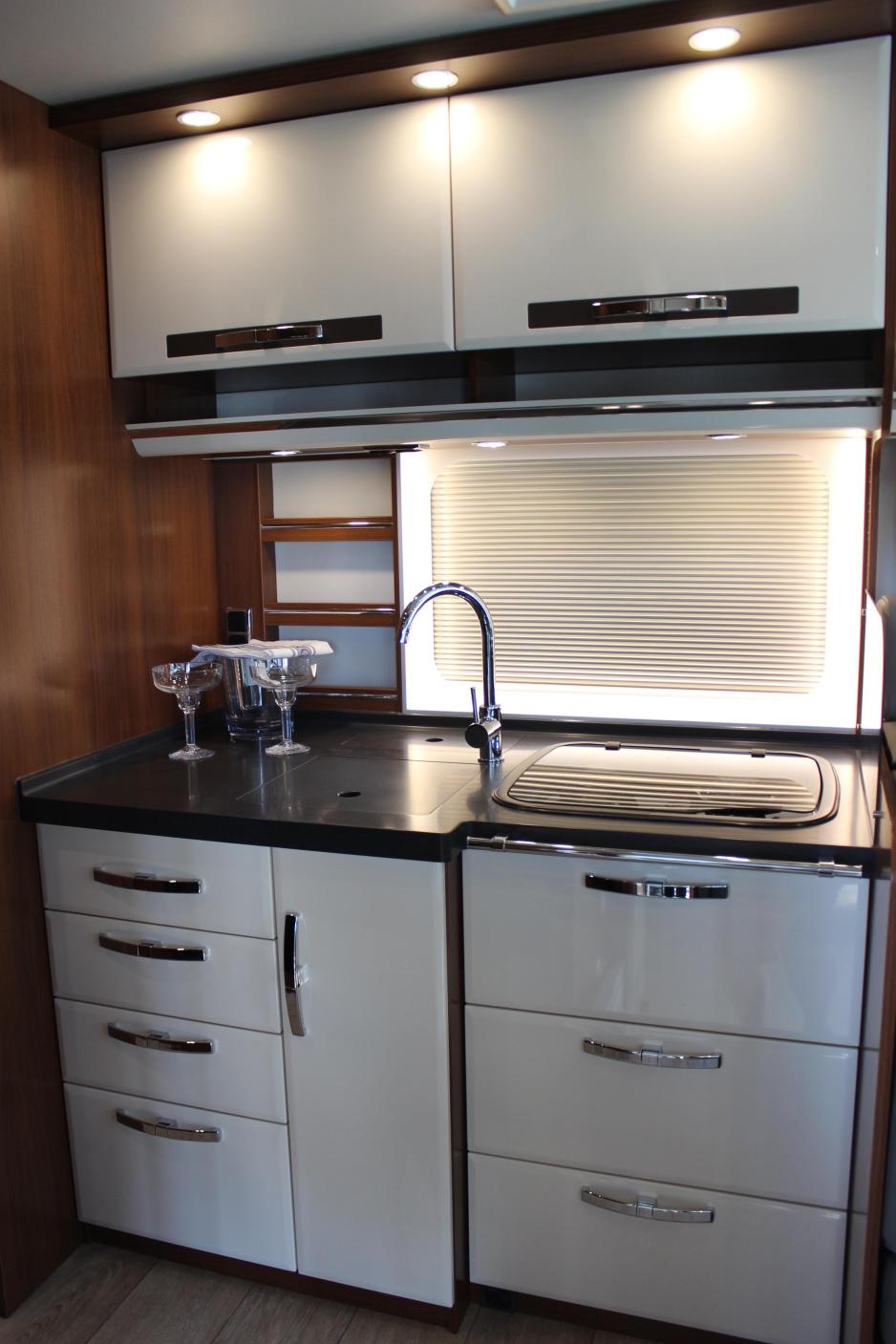 Kjøkkenbenken måler 134 x 70 x h 90 cm. Det er en skyllekum i tillegg til vanlig oppvaskkum og tre bluss. Benkeplaten er støpt med kummene integrert, ganske elegant. De tre kokeblussene har elektronisk tenning. I denne bilen hadde vi forventet avtrekksvifte, men det er en takluke med vifte av typen Omnivent rett over benken. Benken inneholder seks skuffer pluss bestikkskuff og et skap med todelt avfallsbeholder. I tillegg er det romslig overskap med hyller og åpne hyller under. Mye oppbevaringsplass, med andre ord. På motsatt side står kombinasjonen Tec-Tower fra Dometic, som består av kjøleskap, separat frys og stekeovn på toppen. Skapet er på 190 liter brutto, derav 35 liter frys. God belysning og stort luftevindu gir gode arbeidsforhold på kjøkkenet.