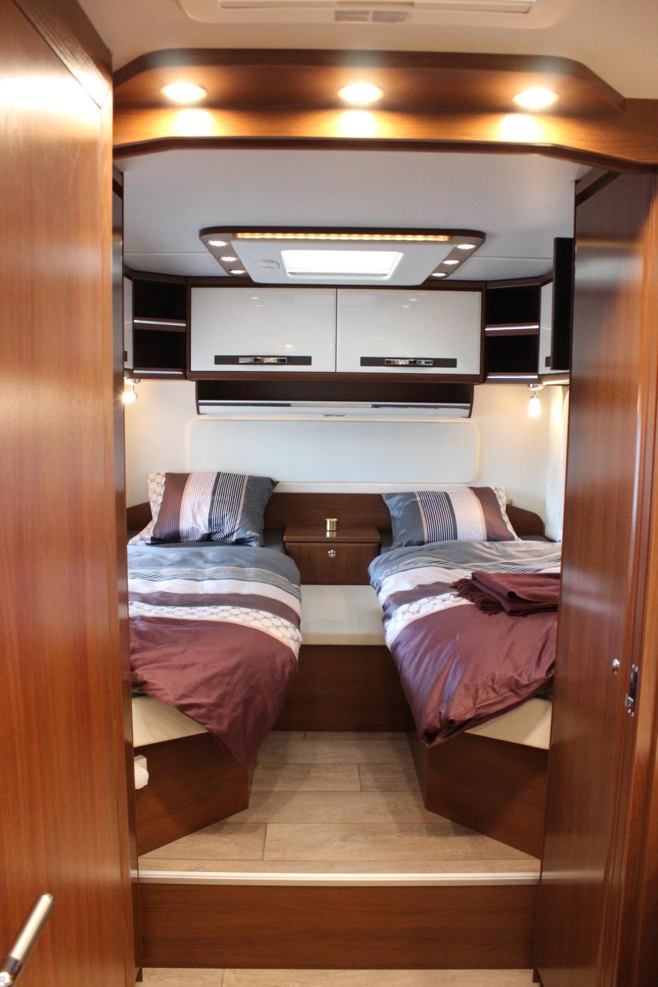 På hver side er det store luftevinduer, og takluken er av medium størrelse. Med andre ord er luftingen bra ved varme netter. Også takviften ved kjøkkenet kan hjelpe til med å trekke kjølig kveldsluft utenfra og inn over sengene ved at vinduene settes på gløtt. LED-spotter i taket og «pyntelys» på bakveggen frisker opp, likeså gjør to lesespotter over hodeenden av sengene. Det er to romslige overskap med hylle på sideveggene og bakveggen, videre er det en hylle under overskapet bak. Her er det plass til mye småtøy.