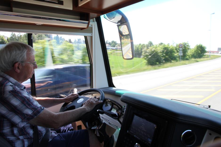 Hvordan er det så å kjøre en så stor bobil? Du venner deg fort til alle funksjoner. Her er det busspeil som sitter oppe foran. De finner du raskt. Styringen er meget bra. Luftfjæringen gir høy komfort og demper slag og risting som vi er vant til fra «vanlige» bobiler. Motoren med automatkassen er helt nydelig der vi glir av gårde i et moderat turtall. Bilens størrelse er en vanesak, bare husk det store overhenget bak ved manøvrering på trange områder!