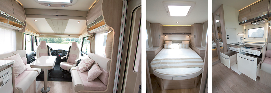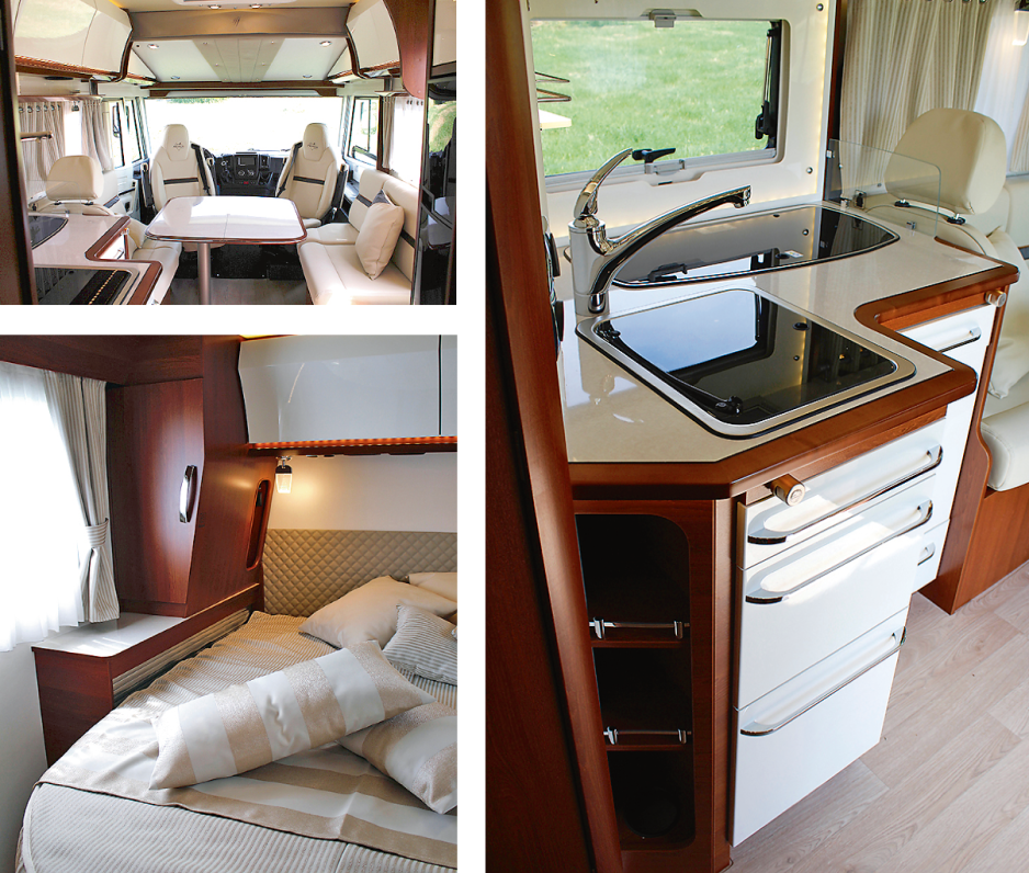 Av de 10 halvintegrerte modellene er det kanskje 666F som vil appellere mest her hjemme, med enkeltsenger bak og Rapidos nye romslige salong med to sidesittere overfor hverandre. Med kjøkkenbenken speilvendt i forhold til hva vi pleier å se åpnes rommet opp, og det blir hyggeligere å lage mat og samtidig snakke med de i salongen. Som tillegg på kjøkkenet kan du få montert stekeovn. 666F har også separat dusj, og enkeltsengene kan gjøres om til en dobbeltseng på 206 x 137cm.