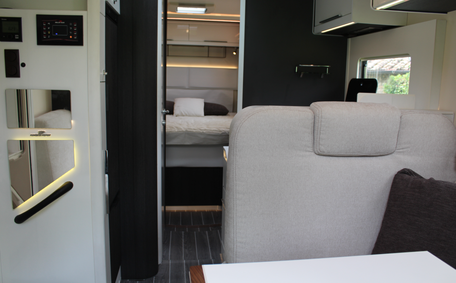 Lyst og stilrent interiør, med stramme linjer, er noe av uttrykket, og det som kjennetegner de nye modellene fra RollerTeam. Produsenten har tre alkovemodeller, og åtte halvintegrerte modeller. De siste kan utstyres med elektrisk senkeseng som tillegg. Modellen Granduca 284 TL med senkeseng, oppleves både som stilig og moderne, ikke minst på grunn av led-lysene. Det hvite bordet har tredetaljer, og kan brettes ut til 88x67 cm. På soverommet finner du den midtstilte dobbeltsengen, hvor det er en noe trang passasje på den ene siden. Madrass og sengebunn kan brettes opp, for å få tilgang til et stort oppbevaringsrom under. Romslig og fin dusj, i hvit høyglanspolert finish med sittebenk, og en solid baderomsdør. Sengemiljøet er lyst og stilrent, og sengen kan høydejusteres for å få større garasje.