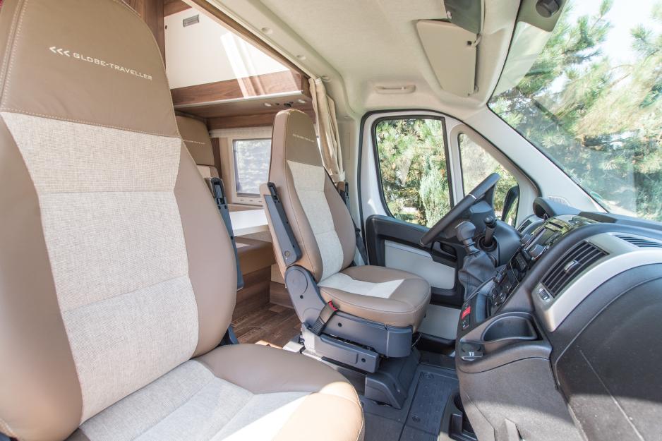 Globe-Traveller Voyager har et påbygg på taket, som produsenten kaller “mini-alkove”. Det gir en høyde på 2,95 meter. Løsningen gir fire soveplasser på alle de fire modellene når “klapp-sengen” oppunder taket foran tas i bruk. Den faste sengen bak er enten en fransk løsning med forholdsvis smal dobbeltseng på 123 cm og bad ved siden av, eller to enkeltsenger med greie mål. Bybobilen leveres enten i 5,99 eller 6,36 meters lengder.