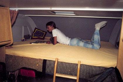 Alkoven her en seng på 200x160cm med latexmadrass på fjærende trespiler, ikke noe å si på sengekomforten. Det sirkulerer varmluft rundt hele alkoven og lufting ordnes av takluke og et vindu. Videre er det stige og sikkerhetsnett. Fri høyde over madrass er 60cm som er gjennomsnitt. Bak har sengen to vinduer og takluke. Størrelsen er 210x145, madrass i samme kvalitet på fjærende trespiler. Høyden fra gulv til sengekant er 110cm og trapp må til. Vanligvis er det faste trinn men her må en aluminiumstrapp hentes fram fra et skap, litt tungvint.