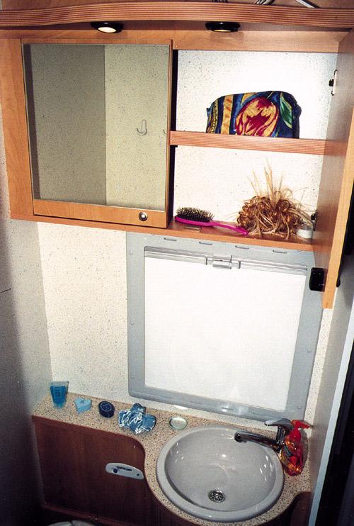 Toalettrommet virket litt trangt (89x80xh200cm) . Toalettet (PP C200) fungerer OK hvis du ikke er spesielt storvokst. Men liker du å skylle ansiktet i vaskekummen er det nesten umulig uten å A: sette deg på toalettet, B: vri baken inn i dusjen, eller C: lukke opp døren. Vurderer du denne bilen, prøv alle funksjoner på badet. Den separate dusjen (54x75cm) så bra ut. Veggene var tilsynelatende troverdig fuget og tettet. Og det var dør, ikke forheng mot resten av rommet. Badet har et smalt speilskap på veggen og et skap under vasken som rommer det nødvendigste. I en så stor og kostbar bil med eget dusjkabinett bør det være rikelig med vann. 115 ltr. vann og 100 ltr. spillvann er i minste laget for denne bilen. Videre er en liten senkepumpe med beskjeden kapasitet noe uventet. Varmekapasiteten er det derimot ikke noe å klage på. I tillegg til kombivarmeren er det plassert en Trumatic E2800 foran i sofaen. Denne forsyner alkoven , inngangen pluss en del av sittegruppen med varme. En varmeveksler under sengen bak forsyner bodelen med varme fra bilens motor under kjøring. For lufting på varme dager er bilen, i tillegg til de to taklukene over sengene, også utstyrt med en takluke av typen Heki 1. Denne gir ikke bare masse luft når den sveives helt opp, men også mye lys ovenfra i sittegruppen.