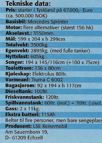 Pris: starter i Tyskland på 67.000,- Euro (ca. 500.000 NOK) Basisbil: Mercedes Sprinter Motor: flere alternativer (størst 156 hk) Akselavst.: 3550mm. Mål: 599 x 204 x h 299cm. Totalvekt: 3500kg. Egenvekt: 2895kg. (med fulle tanker) Nyttelast: 605kg. Senger: 194 x 145/116cm. (+180 x 75cm.) Toalettrom: 136 x 80cm. Kjøleskap: Elektrolux 80ltr. Varmeanl: Truma C 6002 Bagasjerom: 92 x 194 x h 117cm. Dieseltank: 100ltr. Friskvannstank: 120ltr. Spillvannstank: 60ltr. (isol.) + 70ltr. (uisol.) Gass: 2 x 11kg. Ekstra batteri: 115Ah Belter til fire personer, men bare sengeplass til tre. Produsent. LSE Reisemobil Am Sauernborn 19, D- 61209 Echzell