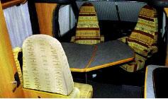 Toalettrommet (78 x 113 x h 190 cm) har ikke separat dusj. Men en glassdør for dusjen hindrer en del av rommet å bli vått. Selve dusjen ser ut til å fungere greit, men rommet er noe trangt og bør studeres nærmere hvis man vurderer denne bilen. Innredningen er stort sett laget av plast, skapplassen er tilstrekkelig. Lufting besørges av en takluke, vindu finnes ikke. Toalettet er av typen PP C200 og tre spotlights gir bra med lys. Sittegruppen består av en toseter på baksiden av bordet i tillegg til de to stolene i førerhuset. Ved å snu stolene og felle ut en klaff på bordet, fungerer det greit for fire personer å spise ved bordet. I toseteren oppbevares bobatteriet og elsentralen. Videre har begge plassene trepunkts sikkerhetsbelte. Bordet pluss klaffen har målene 92/ 55+ x 68 cm. En variabel og romslig sittegruppe for maksimum fire personer.