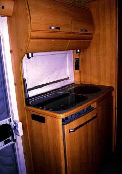 Vel innenfor har vi til venstre kjøkkenbenken, garderobeskapet, bakenfor soveværelset med to enkeltsenger, framover på venstre side toalettrom og sittegruppe. Møblene har en lys varm dekor og putene er holdt i lys brunt (design Sylt). I tillegg til to takluker av type Miniheki over senger og i toalettrom, var det en større elektrisk takluke ved kjøkkenbenken. Kjøkkenbenken (106 x 60 x h 94 cm) har ikke generøse mål og kokeren med tre bluss og vaskekummen fra Cramer tar det meste av plassen. I benken er det bestikkskuff og under et skap med tråhyller. Ved siden av, kjøleskapet (Dometic RM 7401L, 97 ltr.). Som vanlig savner jeg mer romslige overskap på kjøkkenet. Avtrekksvifte finnes ikke, men vindu og den store takluken sørger for lufting.