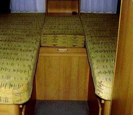 De to sengene bak har målene 197 x 84 og 190 x 84 cm. En 12 cm. Fjærkjernemadrass på fjærende trespiler gir bra liggekomfort. Man kan gå halvveis inn mellom sengene og om ønskelig kan dette fylles med en madrass slik at sengene blir til dobbeltseng. Bredden blir da 84 + 84 + 43 som gir hele 211 cm. En takluke, kombinert med et vindu på hver side gir bra lufting. Garderobeskapet (55 x 60 x h 137 cm) har belysning og i tillegg er det et lite skap på undersiden.