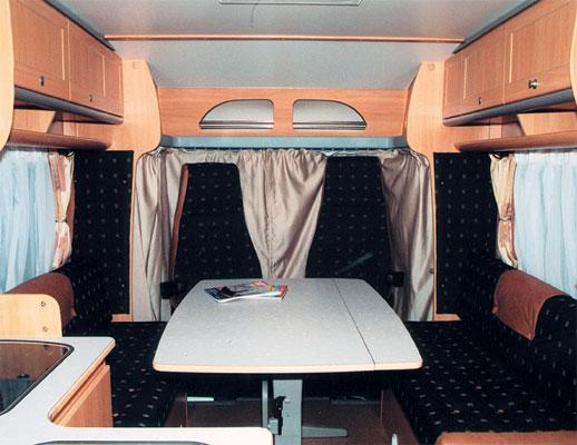 Vel innenfor har vi til venstre en seksjon med kjøleskap, garderobeskap og bad. På motsatt side og forover, dobbeltseng, vinkelkjøkken og sittegruppe (på tvers i bilens bredde). Som alltid er det ikke mye treverk å se, men møbeldekoren er holdt i en lys, varm farge som kalles pæretre. Skapdørenes speil kan fås i en gråstripet overflate som kalles Silverline og sammen med tredekoren for øvrig er dette noe av det bedre jeg har sett. Denne bilen hadde tredekor både i ramme og speil på dørene men dette og skiller seg ut, sammen med baldakiner over kjøkken og garderobeskap. Dette er møbelplater trukket ut i taket over skapene og med innebygget spotlights. Videre virker det som Bürstner, Knaus og Dethleffs kniver om det lekreste designet på tekstilene. Både puter og gardiner er sammensatt av flere forskjellige stoffer med hvert sitt mønster eller farge, og sammensetningen av disse gir et virkelig bra inntrykk. Dette er noe av det bedre jeg har sett av interiør. Taket i førerhuset er delvis fjernet slik at man kan gå oppreist fram til stolene i førerhuset. Disse kan dreies bakover mot sittegruppen som, noe uvanlig, er plassert på tvers. Dette gir større plass enn en vanlig firergruppe på langs i bilen, og med forstolene vendt bakover er det god plass til seks personer om ikke enda flere. Ulempen er at du har ryggen mot veggen, det er ikke like lett å se på utsikten.