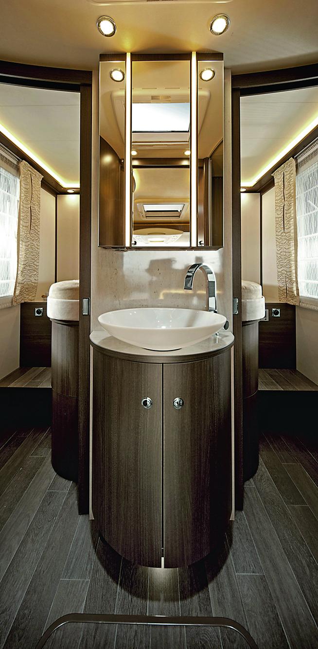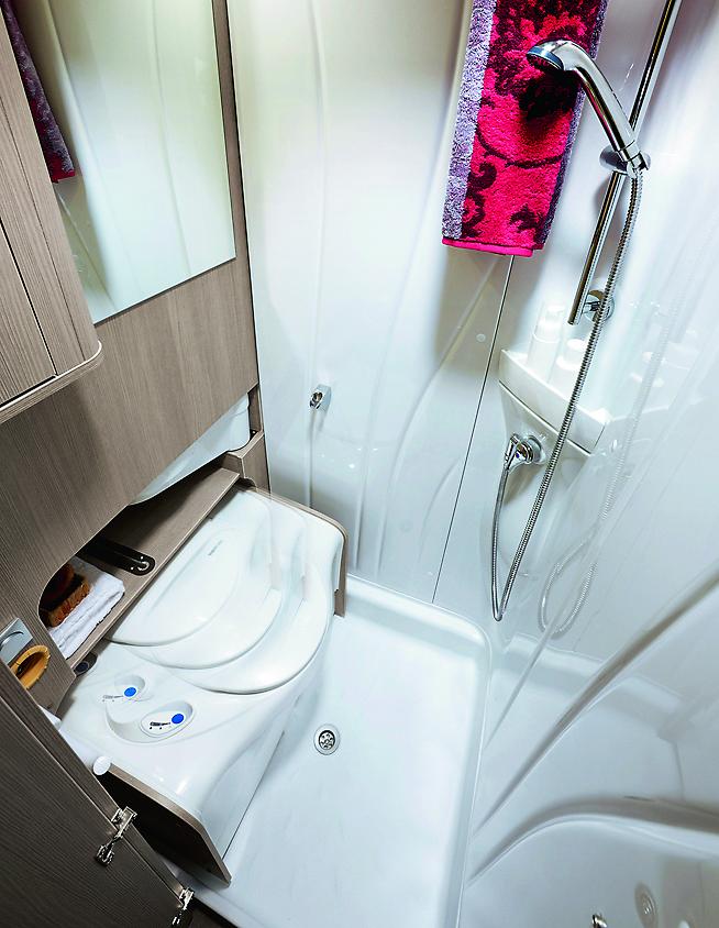 Luxus i bobiler fra 7,5 meter og oppover. Toalettrom på den ene siden og dusj på den andre i overgangen mellom soveværelse og fremre del av bilen. Døren til toalettrommet kan lukkes helt opp og stenger så av framover i bilen. To skyvedører kan lukke av mot soveværelset. Slik får du et stort lukket baderom.