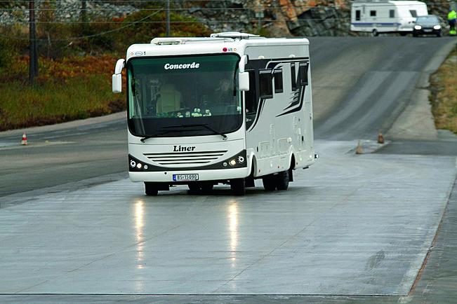– Hvilke forventninger hadde du til glattkjøring med bobil? – Jeg var litt spent, men tenkte mest på å unngå en bråstopp. Bobilen var som vanlig fullpakket for tur. Det betyr at det er mange ting som for eksempel servise og glass som ligger delvis løst inne i skap. I tillegg hadde jeg som vanlig med scooter, båt og påhengsmotor. Jeg tenkte at bilen var såpass tung at den ikke ville skli særlig, men det gjorde den… – Den første øvelsen var å bli kjent med underlaget og gjøre en nedbremsing på rett vei, hvordan gikk det? – Bobilen oppførte seg overraskende bra. Jeg var meget godt fornøyd med ABS-systemet, og dette var første gang jeg fikk testet de skikkelig. Jeg opplevde å ha grei kontroll underveis, men det skyldtes at jeg la noen begrensninger på meg selv. Jeg hadde tross alt ikke lyst til at bilen skulle snurre rundt. Jeg tipper den fullastede bobilen bygget på Iveco-chassis veide drøyt 7,2 tonn slik den var rigget utpåpå banen. Men det var ingen ubehagelige overraskelser.