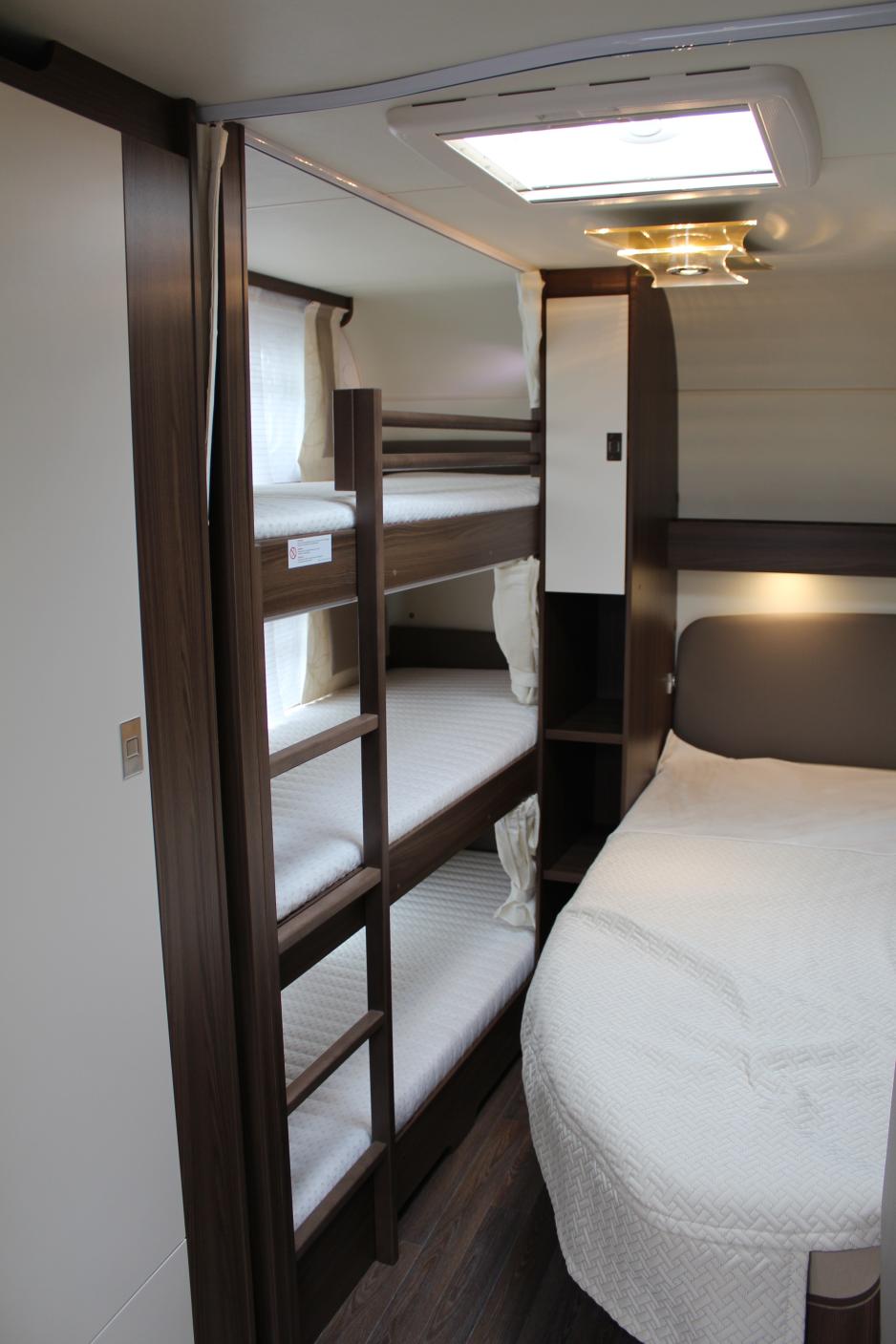 Nordic 600 TK er en ypperlig familievogn, og har dobbeltseng og køyeseng bakerst. Det er mulig å passere mellom disse, og mange vil sette pris på nærheten til ungene som denne løsningen gir. Kjøkkenet er av bra størrelse med tre bluss og vifte over, samt romslig kjøleskap på 160 liter, og fryser på 30 liter. Rett til venstre for inngangsdøren finner du et smart høyskap med mulighet for å henge opp jakker. Sengeavdelingen er imponerende. God dobbeltseng på høyre side med mulighet for å slå ned en ekstra køyeseng dersom det skulle være nødvendig. På venstre side finner du tre køyesenger. Litt lite skapplass er det kanskje, men da gjelder det å pakke smart. Badet er godkjent og byr på dusjmulighet. Sittegruppen er lys med beige og brune innslag og vognen har bra LED belysning som gir en hyggelig atmosfære.