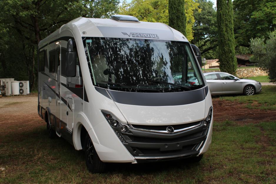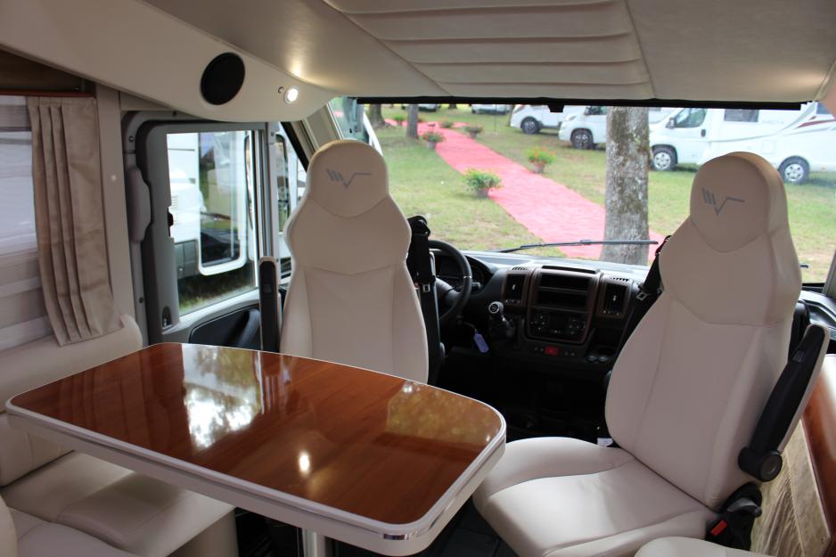 Toscana, Italia: Med utstrakt bruk av høyglans overflater og kombinasjonen hvite skinnstoler og teak-farget interiør gir Mobilvetta sine bobiler et luksuriøst uttrykk.