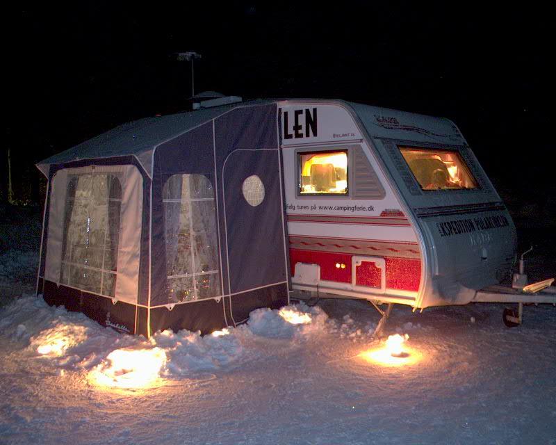 I Jokkmokk ble det også tid til å sette opp vårt Isabella Universal telt. Det var ikke så enkelt i det kalde været, men da det først sto der, var det deilig med en varmestue foran campingvognen. Det kunne merkes. Campingvognen har et Alde Compact 3000 varmeanlegg, som sammen med el-patronen leverte mer enn nok varme. Gulvvarmen er en særdeles god ting, fordi den gir en meget jevn varme opp gjennom campingvognen. Når du er varm på bena, fryser du sjelden på resten av kroppen. Det var ofte ca. 50 graders forskjell på temperaturen ute og inne. Vi lot sirkulasjonspumpen gå hele tiden for å unngå kondens. Det hjalp. Selv om natten, når vi lå 4 personer i vognen og sov, var det ikke den minste antydning til kondens neste morgen. Det er imponerende.