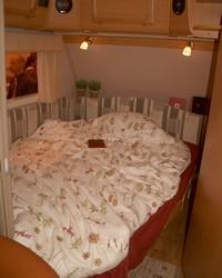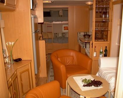 Når du går inn døren bakerst på høyre side har du garderobeskap og 2 køyesenger på din venstre side. På høyre hånd har du et stort kjøkken med kjøleskap, separat fryseboks og mikrobølgeovn. På motsatt side er det en rommelig sidesittegruppe med plass til 4 personer. I forlengelsen av kjøkken og spisekrok er det en stor stue med sofa, sofabord og to lenestoler. I enden er det fast dobbeltseng og badeværelse med toalett.