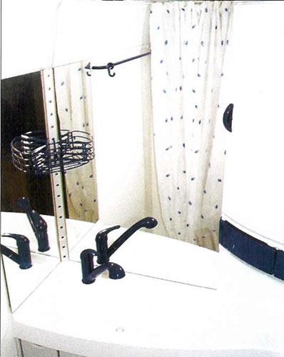 Badet har vask, toalett og dusj i ett. Et forheng kan trekkes helt rundt slik at bare dusjkummen blir våt. Forhenget bør danderes omhyggelig da det ikke er fuget i plateskjøtene på veggene. Med målene 92 x 107 x h 187 cm virker rommet nesten romslig. Doen er av typen C200 og sammen med diverse større eller mindre skuffer og skap skulle det hele kunne fungere bra. Badet mangler vindu, takluke derimot har man spandert.