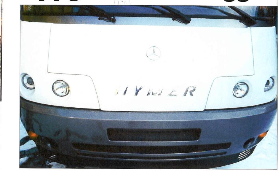 En runde rundt bilen viser oss et karosseri, tradisjonelt bygget med skarpe overganger og rette flater, dog er fronten og skjørtet i nederkant ikke ulikt de andre modellene. Videre er overflaten glatt aluminium, hvit med dekor, altså tidsriktig. På venstre side er det en førerdør (ikke alle integrerte biler har det!), to vinduer og luke til bagasjerommet under dobbeltsengen. Bak er det kun et vindu, ikke stige eller sykkelstativ. På høyre side er det to vinduer (til toalettrom og kjøkken), inngangsdør og gasskasse for 2x11 kg gass. Mens de nyere modellene til Hymer har fått t ”funksjonsgulv” med mange finesser, finner vi ikke mye spennende under denne bilen. Gulvplaten er skrudd rett på Sprinterens orginale chassis og vi ser den isolerte spillvannstanken på 100 ltr. Videre en brønn som inneholder bodelsbatteriet og en skuff som er integrert i sideskjørtet, en typisk Hymer- detalj. Inngangsdøren er plassert i høyde med gulvet, altså høyt. Dette er fixet med en trapp med to trinn som betjenes elektrisk. Altså ingen uisolerte trinn innfelt i gulvet. Men hjulkassene bak var tynne plastskjermer, uisolert, bare kasset inn med finer. Døren må og nevnes, det er Hymers egen konstruksjon, solid og grei. Men i en tidligere Hymercamptest påpekte vi bolten for dørlåsen som stakk ut i døråpningen. Jeg klaget over den etter å ha hengt meg fast flere ganger. Nå var bolten dekket av en plastkappe som svinger unna når døren lukkes. Det hjelper å klage!