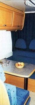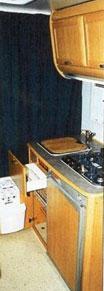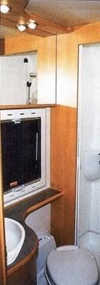 Kjøkkenbenken (58 x 105 x h 90 cm) inneholder skap, skuff og kjøleskap (Elektrolux 103 ltr.). Videre er det oppvaskkum og tre kokebluss. Dette dekker det meste av benkeplaten så det er liten arbeidsflate når både bluss og vask er i bruk. I tillegg til bestikkskuffen og det beskjedene benkeskapet hvor avfallskurven henger i døren er det to overskap med hylle. De er greie nok men den totale skapplassen på kjøkkenet er liten. Avtrekksvifte under overskapet er standard. Det er plassert helt inntil veggen og vil bare fungere om bakerste bluss benyttes. Toalettrom: Til tross for bredde på 80 cm virker toalettrommet trangt. Bruk av WC og håndvask på 80 x 90 cm krever nøye gjennomtenkte bevegelser. Men det går når man ikke er storvokst. Overskapet var i minste laget og døren fungerte ikke godt. Dørlåsen av type mini –latch krever nøyaktig justering og er ofte kranglete. Videre sloss vi med døren. Ideen med sjalusidør er god, men den er vinglete, går tregt i nedre føring og det var fomlete å treffe hullet i karmen med dørlåsen. I dusjkabinettet innenfor (80 x 58 x h 189) var det bare antydning til fuging. Videre var det montert en lysstoffarmatur på veggen inne i dusjen som jeg stillte meg tvilende til. Personlig ville jeg studert lampen og alle skjøter nøye før jeg tok den første dusjen.