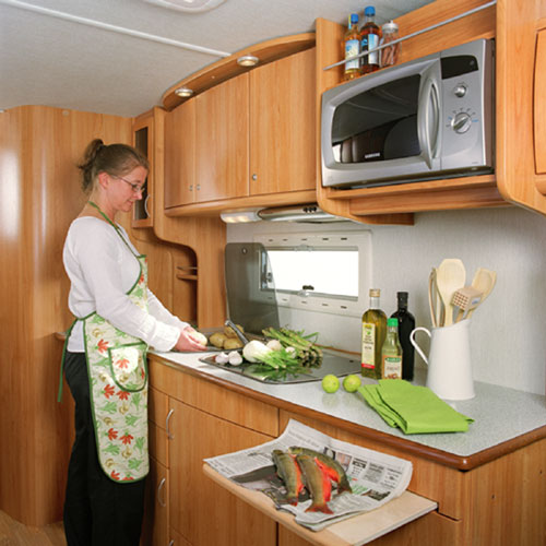 Også innredningen er helt ny med buede flater på alle skap – et design som er framtatt i samarbeid med spesialistene på det italienske firmaet Technoform. Overskapene har blitt dypere, og 2,3-meters vognene får samme type overskap som de bredere modellene. Beslagene er også nye, i likhet med laminatskivene på bord og benker, og man har utviklet en helt ny løsning for høytalermonteringen. Stofftrekkene finnes i fire forskjellige farger og i to ulike varianter, og i tillegg kan man by på samme ”miljøtrekk” som i 2003 (stripete bomullstrekk og to ulike skinntrekk.