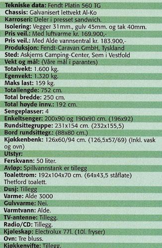 Vekt og mål: (Våre mål i parantes) Totalvekt: 1.600 kg. Egenvekt: 1.320 kg. Maks last: 159 kg. Totallengde: 752 cm. Total bredde: 250 cm. Total høyde innv.: 192 cm. Sengeplasser: 4 Enkeltsenger: 200x90 og 190x90 cm. (196x92) Rundsittegruppe: 231x154 cm. (232x155,5) Bord rundsittegr.: (88x80 cm.) Kjøkkenbenk: 126x60/94 cm. (126,5x57/69) (Inkl. vask og ovn) Utstyr: Ferskvann: 50 liter. Avløp: Spillvannstank er tillegg Toalettrom: 192x104x70 cm. (64x43,5 ståflate) Thetford toalett. Dusj: Tillegg Varme: Alde 3000 Gulvvarme: Nei. Varmtvann: Alde. TV-antenne: Tillegg. Radio/CD: Tillegg. Kjøleskap: Electrolux 77l. (10l. fryser) Ovn: Tre bluss. Kjøkkenvifte: Tillegg.