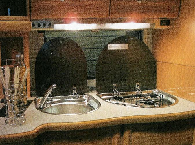 Kjøkkenet er ganske standard i forhold til andre 560-vogner. Ikke veldig stor arbeidsflate, men den duger. Kjøkkenbenken inneholder tre kokebluss og en vask, i tillegg til en arbeidsflate på venstre side. Belysningen på kjøkkenet er bra, og vi synes det var spenstig med microbølgeovn som standard utstyr. Avtrekksvifte er desverre tilleggsutstyr på denne vognen. Vi synes vel dette med fordel kunne vært montert når vi igjen nevner at microovn er standard. Ovnen i kjøkkenbenken er av den typen med betjeningsbryterne inne i selve ovnen. Det gjør at plassen mellom de tre blussene blir mindre og det betyr at man helst bør ha med seg små kjeler for å lage mat. Skal du frem med stekepannen blir det liten plass til annet samtidig. Kjøleskapet er i tysk stil plassert på gulvet, 77 liter inkludert en fryser.´Til venstre over kjøkkenbenken er et rundt vitrineskap med svingbar plastdør. Delikat utformet og det setter en ekstra spiss på innredningen.