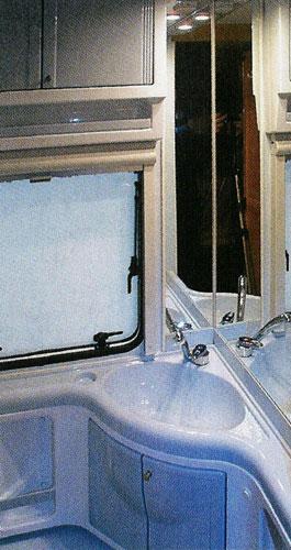 Badet sitter midt i vognen, på andre siden av kjøkkenet. Det er ustyrt med et Thetford fast toalett, en vask med underskap, et stort speil, vindu og to overskap. Det er ingen dusj i denne vognen, men det finnes i de større Fendt-modellene. Går vi over på andre siden av vognen igjen, mellom kjøkkenet og soverommet, finnes et høyskap. Soverommet er utstyrt med to enkle senger med lagerrom under. Begge enkle å heise opp og lett tilgjenglige. Mellom sengene er det plassert et felles nattbord, og over er det totalt ni overskap. Lagringsrommet under sengene kunne med fordel vært ustyrt med en bunn, slik at det fortsatt var sirkulasjon av luft når disse ble pakket fulle av dyner, tøy og annet. Med luftbåren varme er det jo en forutsetning at luften får sirkulere.