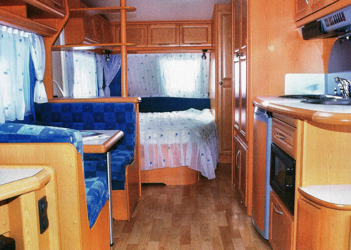 Når vi går inn i Prestige 650UMFe finner vi rundsittergruppen til venstre, midtsitteren og kjøkkenet i midten og bad og dobbeltseng fremst i vognen. Den er åpen og gir et inntrykk av en stor og romslig vogn innvendig. I gulvet er det varme, og alle vogner fra Hobby leveres blant annet med Truma Ultraheat el. Varme, TV-antenne, avtrekksvifte og fem års tetthetsgaranti inkludert i prisen. Vognen er lys med en blanding av hvitt og blått i gardiner og putetrekk. Rundsitteren: Denne er ganske standard, med et firkantet bord. I hvert hjørne er det montert ”lysrør”, spot og hyller. Under rundsitteren er det lagerrom. Vanntanken er montert i sittebanken nærmest døren, og her er det derfor kun plass til sko og lignende som plasseres med tilgang fra siden ved inngangen. Vi forsøke å komme oss under og ned i laggerrommet langs bakveggen av vogna. Det skulle vise seg å være en skikkelig utfordring. Først måtte alle putene ut av rundsitteren, og bare det gjør at alt som fra tidligere er plassert påbordet må vekk. Her kunne vel produsenten funnet opp en litt annen løsning?