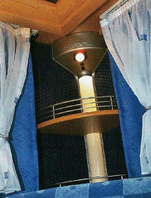 Foran i vogna er badet plassert på den ene siden og dobbeltsengen på den andre. Utenfor badet er vasken plassert, og en fin sminkeplass for mor med et stort speil og noe skapplass. Baderommet inneholdt en dusj, et fast toalett, og noe hylle og skapplass. Vi fant fort ut at en person på 185cm. ville ha store problemer med å få dusjet her. Man klarer rett og slett ikke å stå oppreist. Både dusj og bereder er plassert i taket, og da tar ikke det unødvendig plass i resten av rommet. Vel og bra. Dusjforhenget var heller ikke noe som ga oss trygghet på at vann ikke vill finne veien dit det ikke skulle. Som mellom bunnplata og dørkarmen. Denne vognen har soveplass til fem personer. To i dobbeltsengen, to i rundsitteren og en i midtsitteren. En fin løsning er ”trekkspillforheng” som kan dras for slik at det lukker både soverommet bak i vognen og midtsittergruppa fra resten av vognen. Dette skjer med to separate forheng.