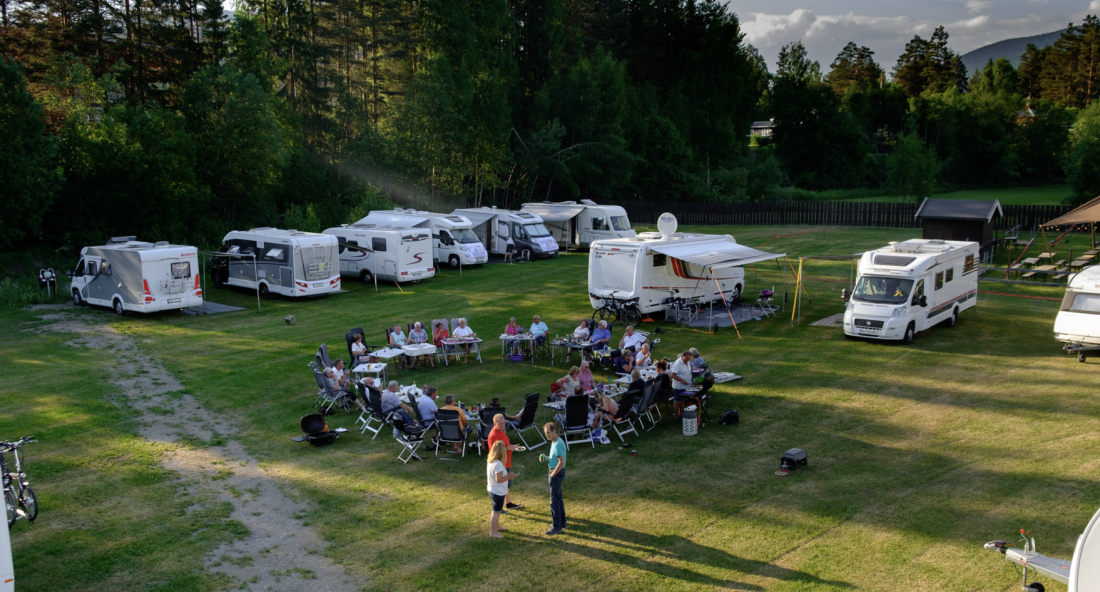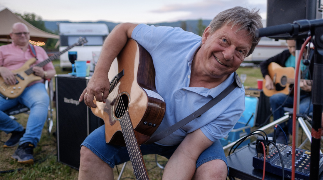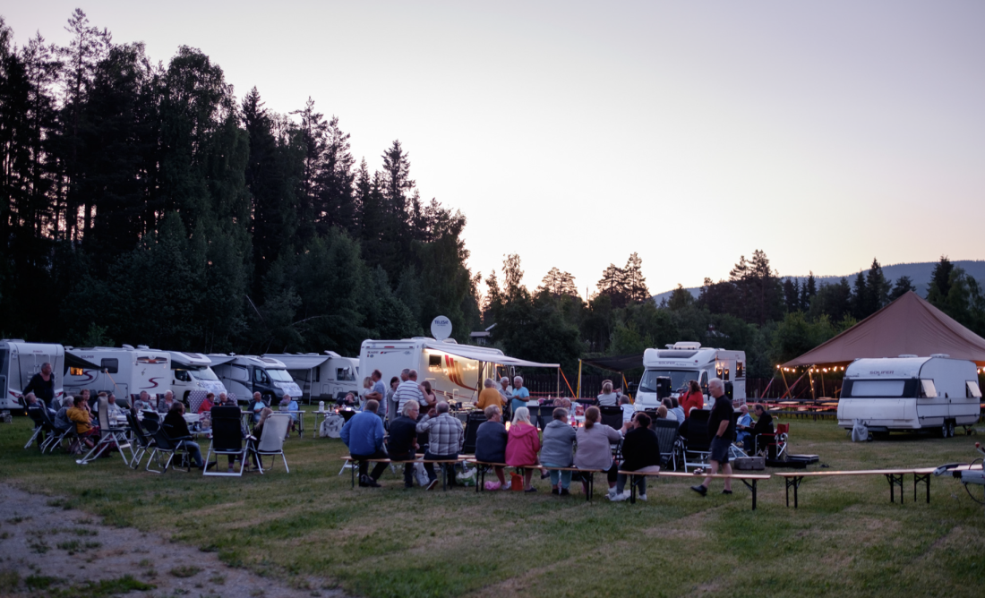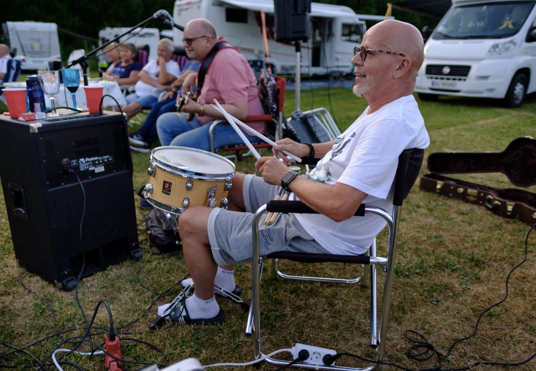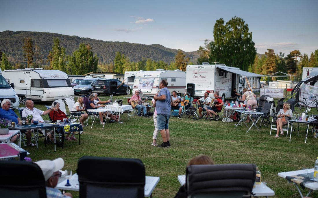 Musikalsk camping og god stemning er stikkord når denne gjengen av bobil- og campingfolk reiser på tur sammen.