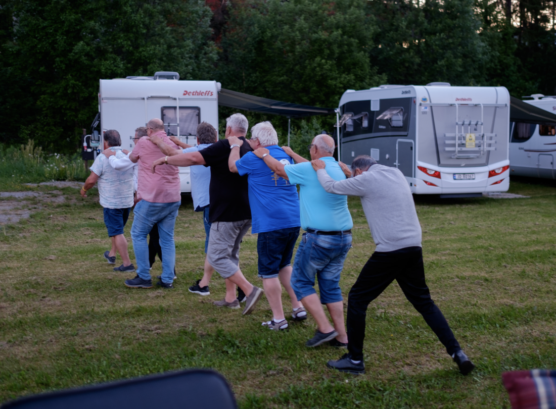 – En glad camper er som oss. Litt vanskelig å definere, men vi er sosiale, glade i turer, å reise sammen med flere, treffe andre og å skape god stemning. Du kan si at vi driver ambulerende allsang, dans og musikk, sier Lasse med et fornøyd smil.