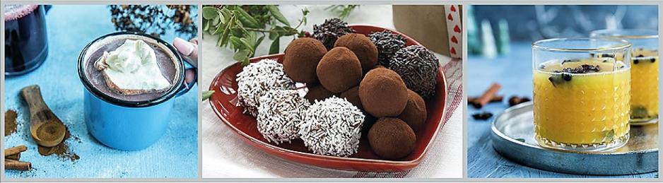Du finner alle oppskriftene på matprat.no ved å klikke på linkene: Varm sjokolade med rødvin, konfektkuler, krydret klementinjuice.