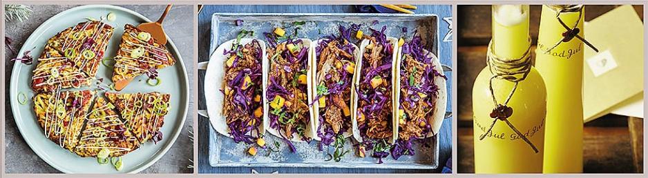 Du finner alle oppskriftene på matprat.no ved å klikke på linkene: Potetkake med pinnekjøtt, taco med julesmaker, eggelikør