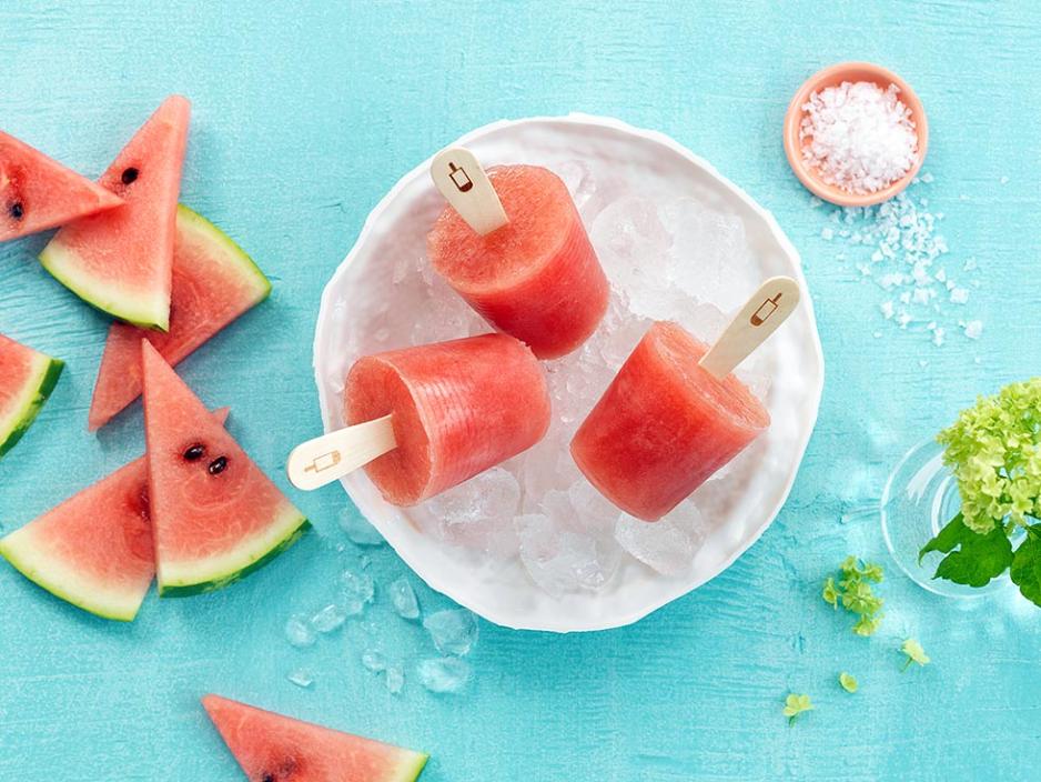 - Sett formene i fryseren i 3-4 timer, eller til sorbeten er helt stiv. Stikk inn ispinnene når blandingen har såvidt stivnet.