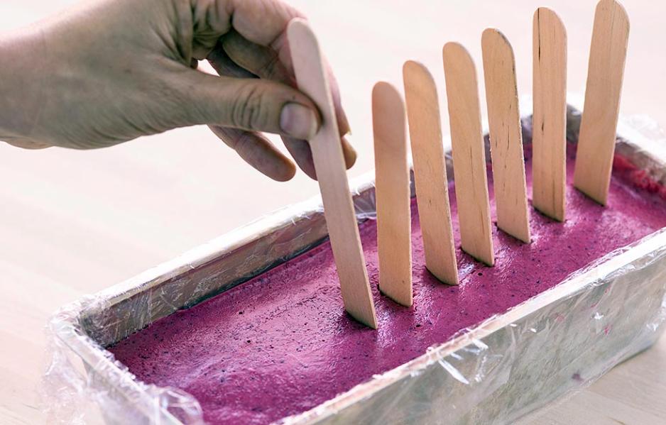 - Sett ispinner av tre i formen når blandingen begynner å stivne. Sett formen tilbake i fryseren og la den stå til blandingen er helt stiv.