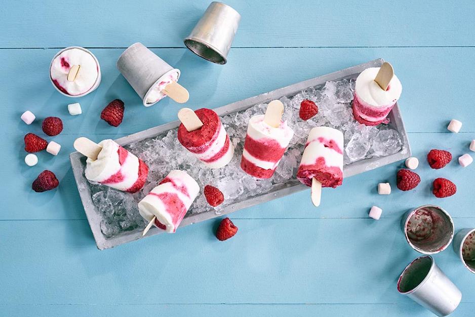 - Fyll de to blandingene lagvis i små isformer, kopper eller former. Sett en ispinne i hver form og sett i fryseren i mist 3 timer.