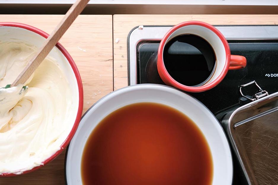 - Lag en kopp sterk kaffe, hell det i en skål, bland med resten av Marsala vinen og la det avkjøle.