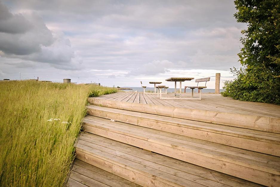 Det tar bare fem minutter å gå fra bobilparkeringen til en nydelig strand der du kan bruke hele dagen å bare slappe av. Om du heller bare vil ha en rask dukkert, så er det en liten strand rett bak dusjfasilitetene, ved sjøen. Her finner du også en badstue, og hvis du er heldig og spør pent, er det mulig du kan snike deg inn. Det var helt fantastisk å sitte inne i den varme badstuen en vindfull sommerdag med panoramautsikt utover sjøen.