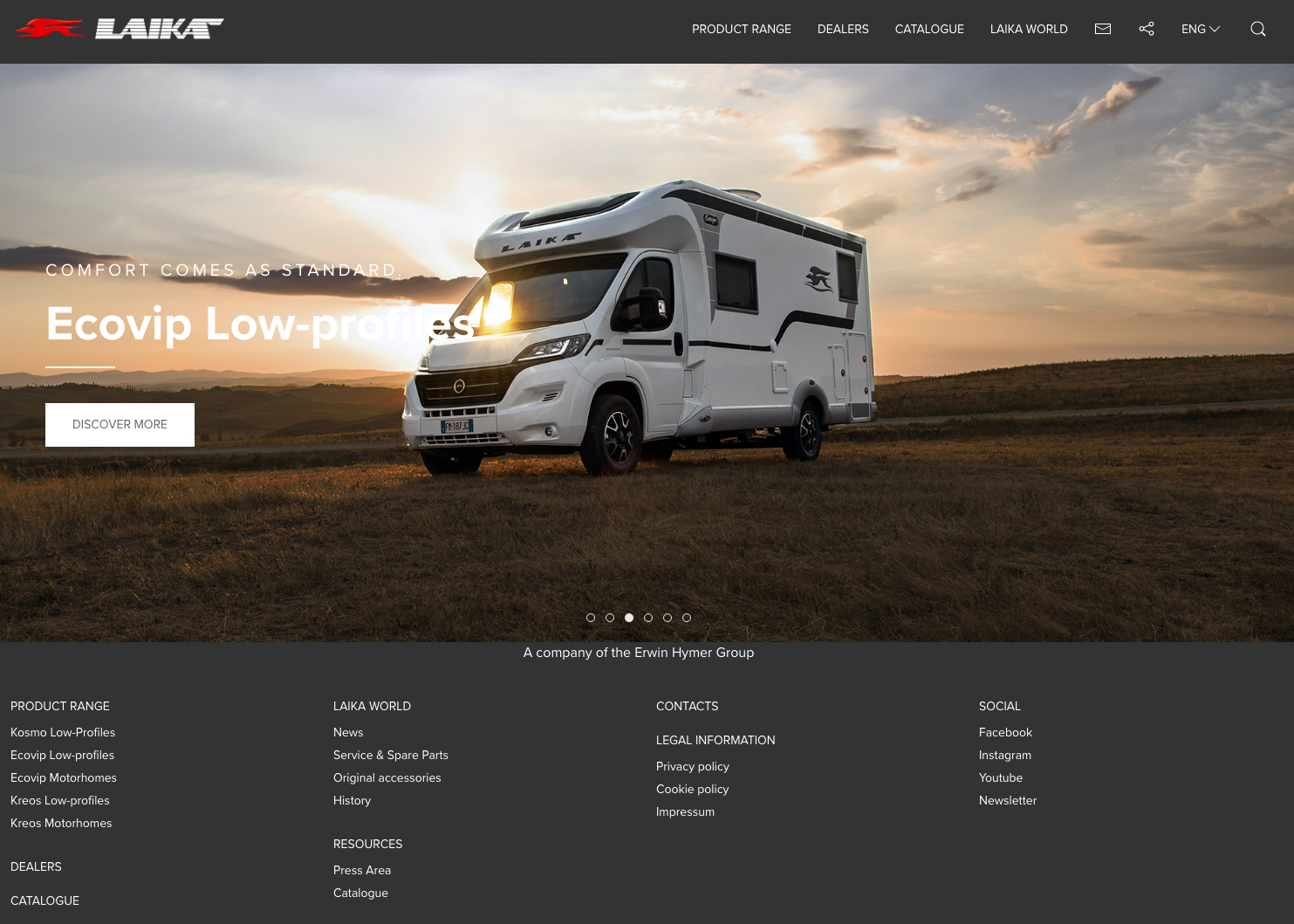 Det første er Produktområde er delen som er dedikert til Laika-serien, for å lære mer om våre kjøretøy, fordelt på type og rekkevidde. Høydepunkter, interiøroversikter, datablad (nedlastbar PDF) og et omfattende galleri er gitt for hver modell. Å velge bobilen i dine drømmer blir enklere enn noensinne!