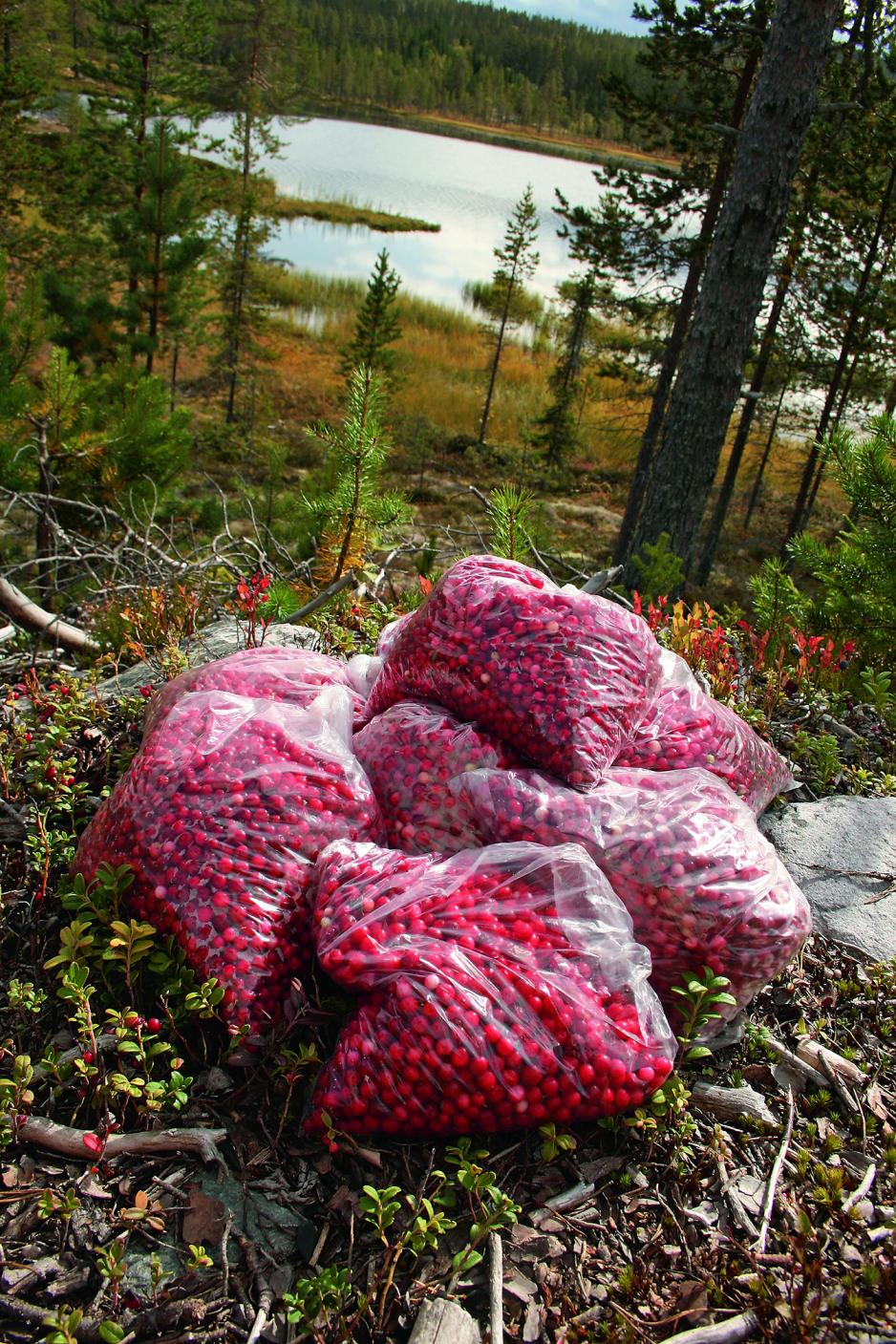 Det viste seg snart at plukkinga var smittsom, snart var vi to med rumpa i været, og én brødpose ble kjapt til mange. Til slutt satt vi igjen med hele sju kilo tyttebær! Og det på bare et par-tre timer.
