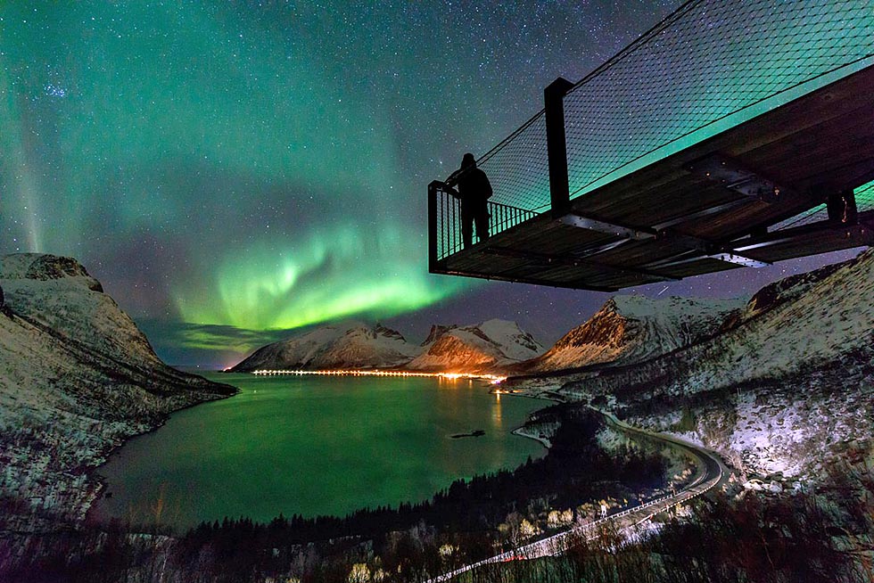 Karianne Fredriksen, som er markedssjef for Hamn i Senja, sier turistvegene har hatt stor betydning. Der er nordlys- og sightseeing-opplevelser langs turistvegen blant aktivitetstilbudene.