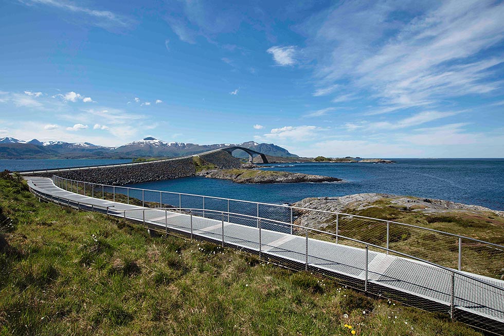 Atlanterhavsveien er en imponerende veikonstruksjon som tiltrekker både nordmenn og utlendinger. Dette er noe av det beste Norge har å by på da du kommer utrolig tett på havet og naturkreftene. Vanligvis er det utfordrende å finne parkeringsplass for å gå Svevestien, og det står fiskere overalt. Men denne gangen var det glissent på tross av at det var en fredag ettermiddag med sol på blå himmel.