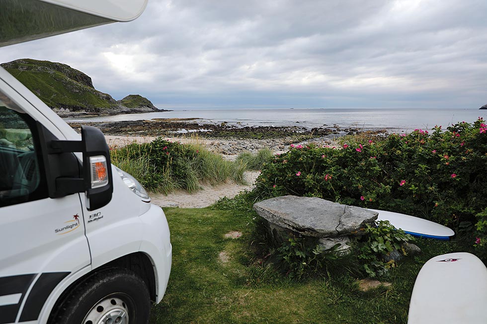 Stranda er i seg selv verdt et besøk: Den lyse sanden kunne like gjerne kunne vært på en sydhavsøy, og når lyset er riktig, frister vannet med lokkende turkise farger. Selv om vannet ser fristende ut, er det kaldt, og selv midt på sommeren er det svært få som bader uten våtdrakt. Husk også vindtette klær, det er sjelden at det ikke blåser merkbart her.
