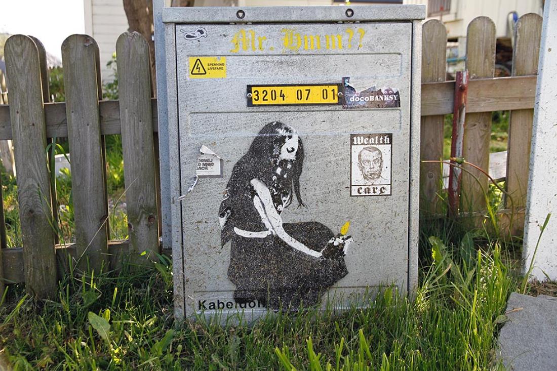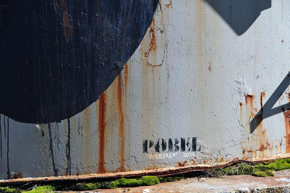 Et av mine personlige mål med turen til Henningsvær, bortsett fra å oppleve den fine naturen, var å finne et spesielt gatekunstverk av kunstneren Pøbel fra 2014. Han har ved flere anledninger reist rundt i Lofoten og satt sitt preg på falleferdige bygninger, med tillatelse fra eierne.
