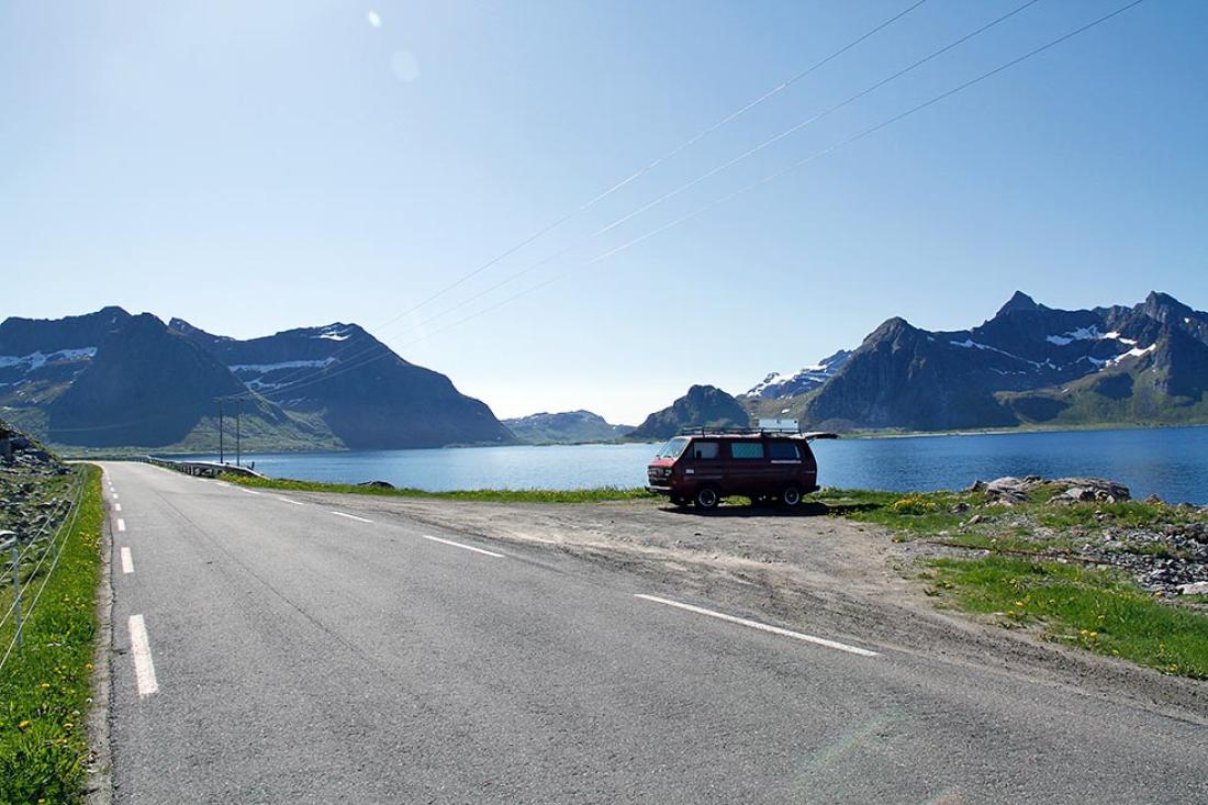 Parkeringen vi valgte oss ligger rett ved veien, men det er lite trafikk her om natten. Det ga oss ro og en overraskende sterk følelse av å være tett på naturen. Vi var alene på plassen denne natten midt i juni, men i høysesong kan jeg se for meg at det er flere som tar området i bruk. Lommene var store og romslige, og kan nok lett romme to biler hver. Vi utnyttet at vi var alene og kunne breie oss ut, og rygget på plass med åpen bakluke ut mot havet. Det er ikke mulig å klage på den utsikten som møtte oss neste morgen: Blått, stille hav, sol og snødekte fjelltopper.