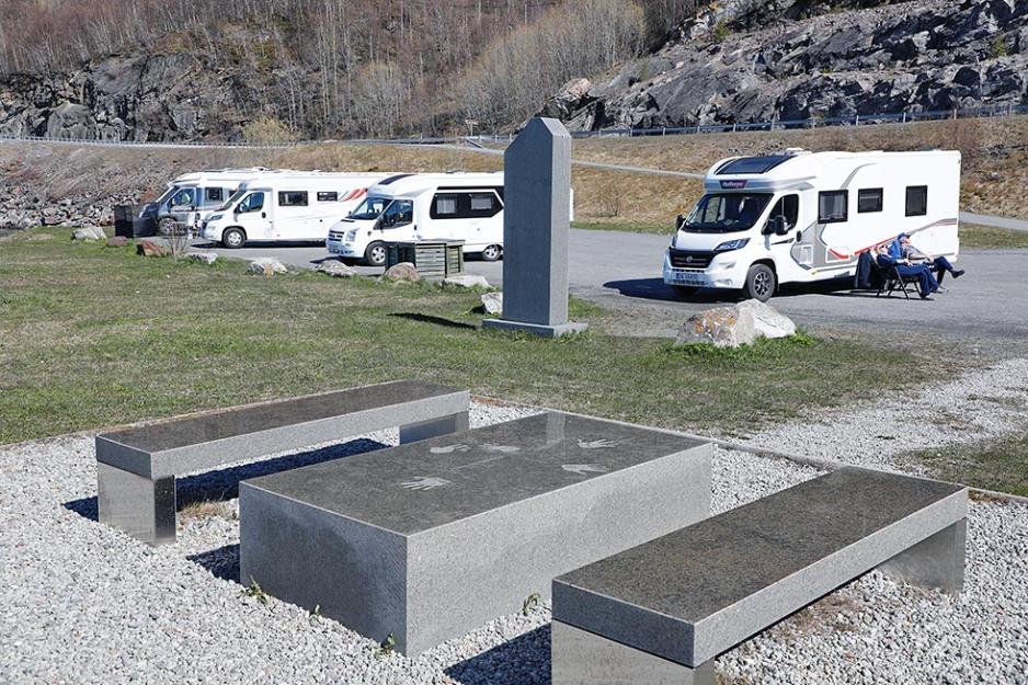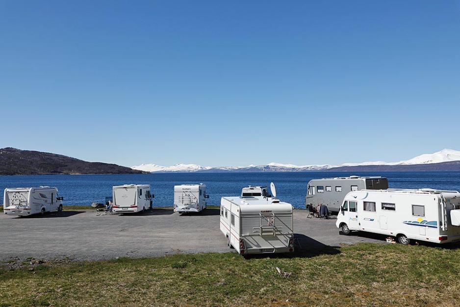 På rasteplassen er det en drøy håndfull bobiler som får stå helt i ro denne flotte vårdagen. Eierne har slått seg ned i gode stoler på solsiden. Bord dekket med duker får jobben med å passe på vafler og kaffekanner, som trylles frem. Flere av de bobilreisende holder hverandre med selskap, praten summer overalt og det er lett å finne felles glede i sola og med våren som endelig er her.