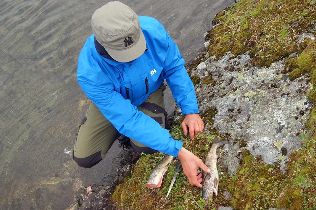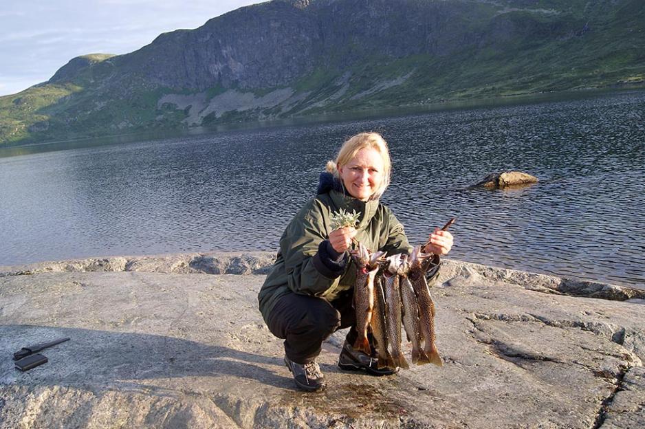 Så det er ingen grunn til å legge seg for å sove nå, det kan vi gjøre senere, når fisken også sover. Vi har uansett kommet oss opp i overtrøtt tilstand, og er skikkelig gira på å komme i gang. Klokka er rundt halv fire på morgenen, den lille båten som ligger her hele året, har fått påhengsmotoren sin på, og vi skal sveive inn feriens første ørret.