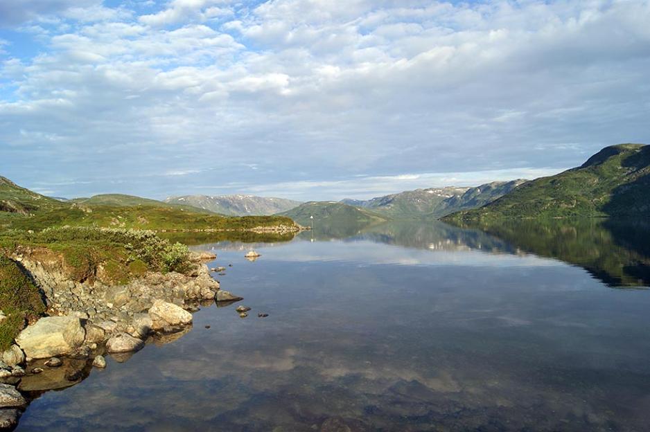 Så i en drøm av en bobil, la vi mil etter mil bak oss, skikkelig sugne på ferie og fjelltur. Mange av milene trillet vi dessuten på asfalt som var nylagt siden sist, og landskapet blir vakrere og vakrere jo nærmere målet vi kommer. Turen opp gikk som en lek, og plutselig ligger det der, vårt drømmested. Fjell og vann - og akkurat nok plass til oss og bobilen helt nede ved vannet.