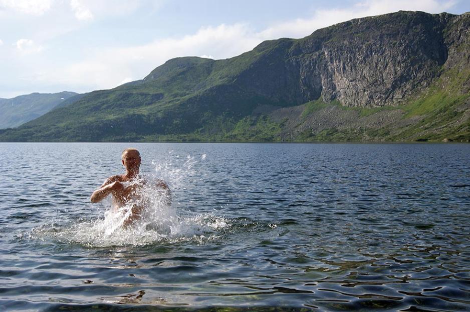 Vi bestemmer oss for at til og med fjellvannet skal prøves ut i år, blir det en iskald opplevelse, er det jo bare å løpe inn og ta seg en god og varm dusj. Som sagt så gjort, etter frokost, kaster vi oss ut i vannet...og det er slett ikke så ille. Iallefall ikke når vi kan gå inn i bilen få på tørre, varme klær igjen.