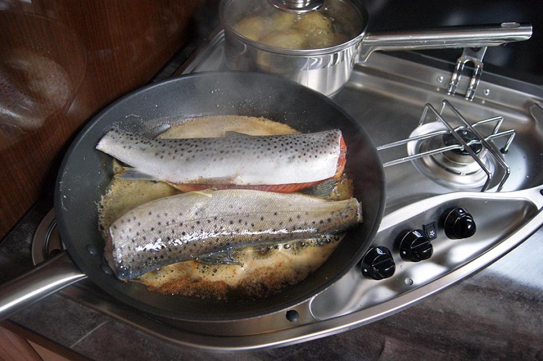 Ingen grunn til å sutre over at bilen er varm og god, at alt av klær og utstyr ligger ryddig og lett tilgjengelig i hyller og skap, senga står oppredd, med gode madrasser og myke dyner, og vi kan bare gjøre det vi har aller mest lyst til. Nemlig å fiske, slappe av og nyte ferien.