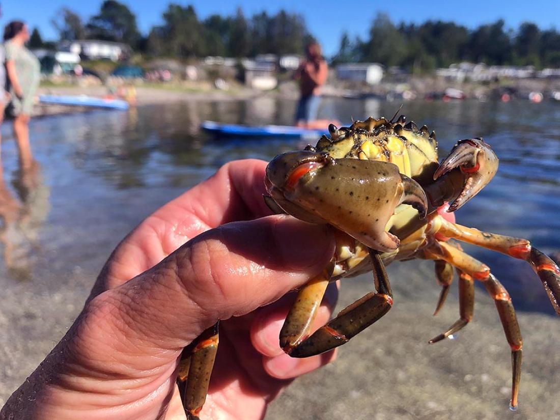 Det er norsk sommer på Breivik Camping. Den ene dagen blåser det friskt og temperaturene minner om høst. Neste morgen skinner solen, og både folk og krabber ønsker å få med seg godværet.
